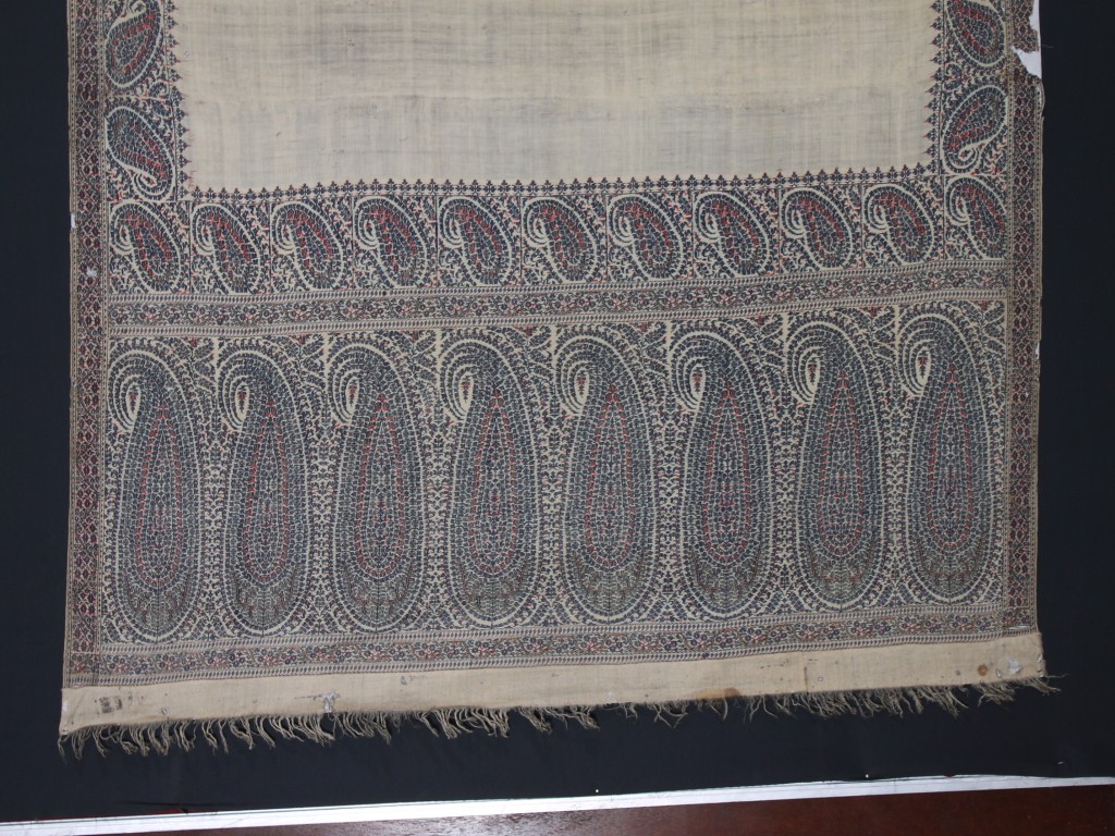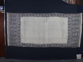The outmost border is a typical example of the art of the rafoogar, the sewer of fine seams. The ground color may be white, but gray the more commonly used in border design.
