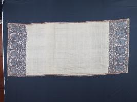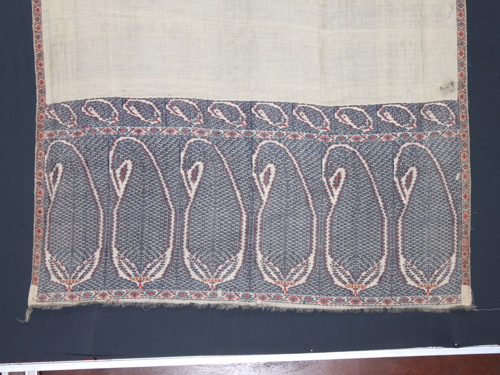 The outmost border is a typical example of the art of the rafoogar, the sewer of fine seams. The ground color is white, but blue the more commonly used in border design.