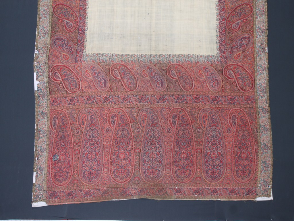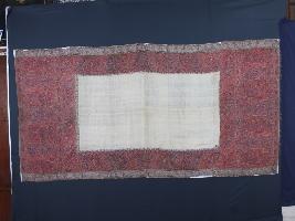 The outmost border is a typical example of the art of the rafoogar, the sewer of fine seams. A special feature of these embroidery shawl is the used of border on all sides. The ground color is white, but red the more commonly used.