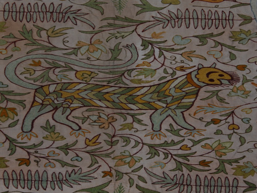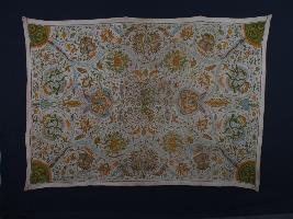 A special feature of these embroidery curtain is the used of lion figure in the central flower motifs. The ground color may be white, but orange and green the more commonly used with colorful patterns all over the fabric.