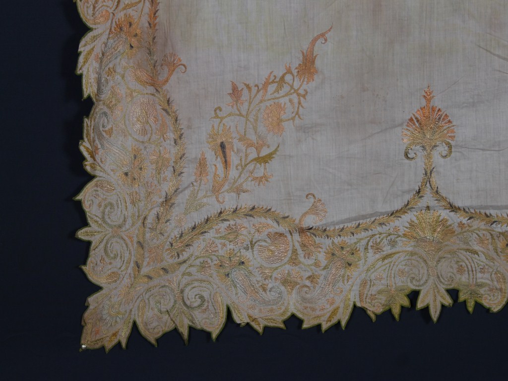 The table cloth is an integral part of the history of Kashmir. The ground color is white, but brown the more commonly used in border design and floral motifs.