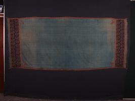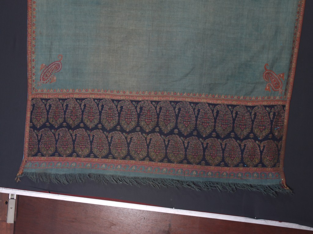The famous Kani shawl is an integral part of the history of Kashmir. The ground color is white, but blue the more commonly used with almond type patterns on both sides.