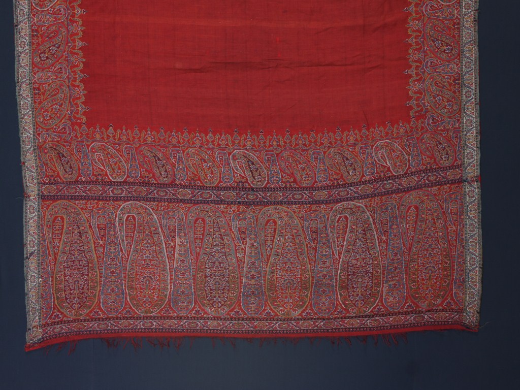 The famous Kani shawl is an integral part of the history of Kashmir. The ground color is red, but blue the more commonly used with colorful patterns all over the sides.
