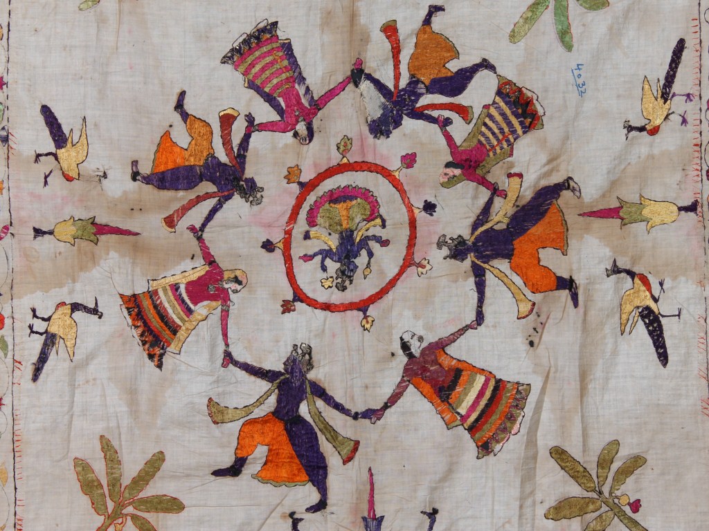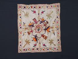The embroidered and colorful cloth is an integral part of the history of Kashmir. A special feature of this cloth is colorful floral patterns all over the fabric. This cloth depicts four-armed Vishnu, seated on kamalasana. Probably this episode indicates the Rasalila of the Bhagavatapurana.