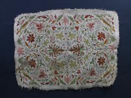 | Description / विवरण | This is a modern adaptation of the traditional namda, worn by Kashmiri people. The namda has pink, green and brown flower decoration in the centre with a white background. The entire surface of the fabric is smooth with embroidered. |