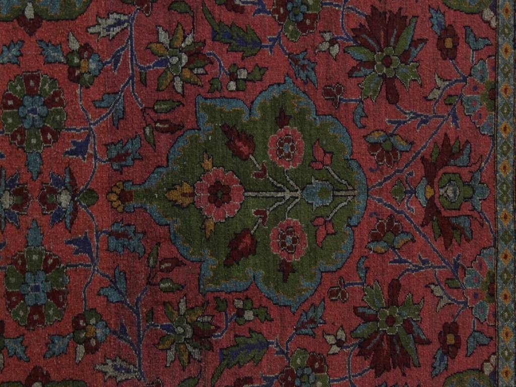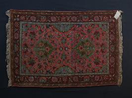 The carpet combines a bold flower and leaf effect. The entire surface of the carpet is smooth with colourful patterns all over the fabric. The ground colour may be pink, but green the more commonly used in decoration.