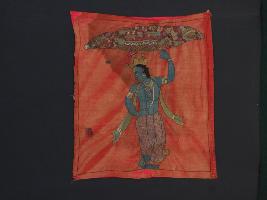 | Description / विवरण | The embroidered and painted cloth is an integral part of the history of Kashmir. The entire surface of the fabric is smooth and in this cloth Krishna is shown lifting the mount Govardhana with his little finger of his left hand. The colour of the body of Krishna is blue and wears jewellery, a pink drapery with green angavastra. The ground colour may be red, but blue the more commonly used. |