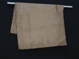 | Description / विवरण | The embroidered and design cloth is an integral part of the history of Kashmir. The entire surface of the cotton cloth is smooth with lining patterns all over the fabric. The ground colour of this cloth is light brown with some badly marks. |