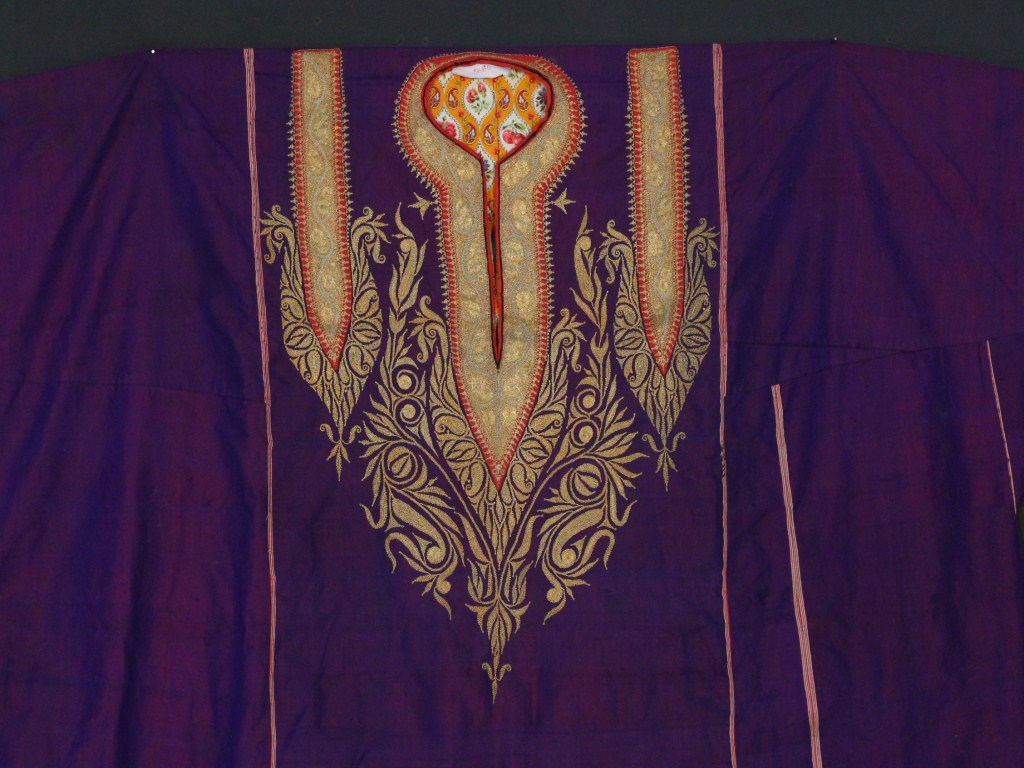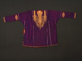 The embroidered and designed cloth is an integral part of the history of Kashmir. The entire surface of the purple coloured Pharan is smooth with colorful design patterns all over the neck and some portion.