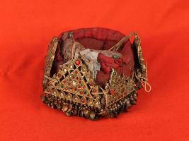 | Description / विवरण | This stuffed kunda-kasaba is made red cotton clothe. Outer portion has four perforated triangular brass plates studded with red and green glass gems. Drop shaped tassels are suspended at the lower portion. |
