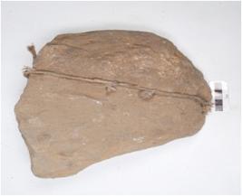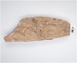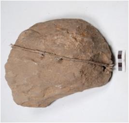 | Description / विवरण | Fragment of sand stone saddle, plano convex cross section, rough surface. |