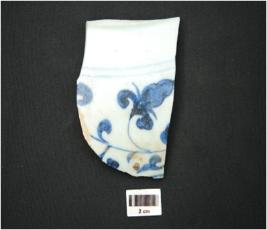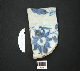 | Description / विवरण | A fragment of vitreous blue china dish, having floral design picked up in blue pigment on bluish background on both sides. |