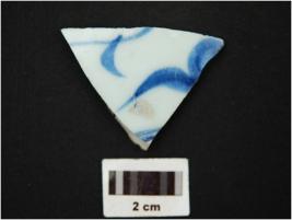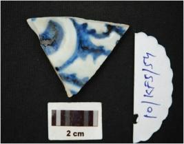 | Description / विवरण | A fragment of vitreous blue china vessel, having floral design picked up in blue pigment on bluish background and section. |