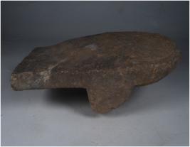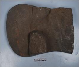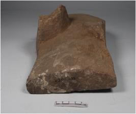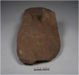 | Description / विवरण | A broken stone saddle with two legs and smooth and decorated surface. |