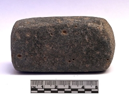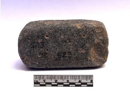 | Description / विवरण | Roughly rectangular shaped stone muller with smooth end and rounded edges. One end is convex while the other and the sides are flattend. It is blackish brown in color. And have a weathered and abraded surface. |