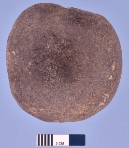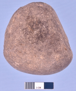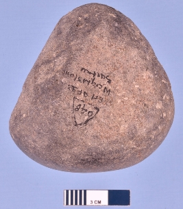 | Description / विवरण | A solid heavy stone object used for grinding with a wide end on one side and tapering end on the other. It was probably in use along its wide end as it is smoother than the intact end. The other surfaces was used for holding. The stone used is light gray coloured basalt. |