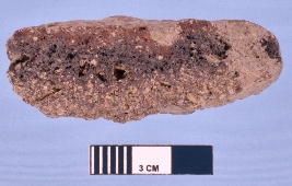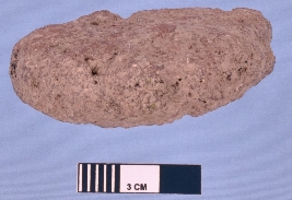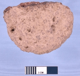 | Description / विवरण | Fragment of terracotta skin rubber, semi circular in shape with rough surface due to number of voids. One circular intact end is thinner while another damaged end is thick. Black colour appear in the cross section due to ill firing. |
