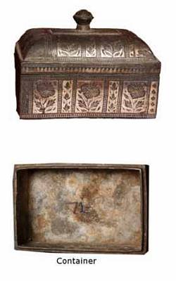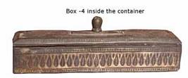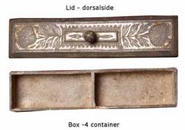| Description / विवरण | The small rectangular betel nut box no.4 consists of two parts one is a lower container and upper lid. The container is divided with two partitions. The side walls are decorated with cone shaped flower twigs. The lid has an elevated central part with a solid knob. The dorsal face is decorated with flower twigs on either side of the knob. |