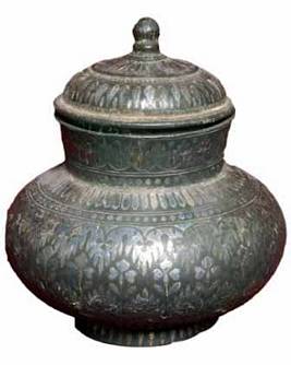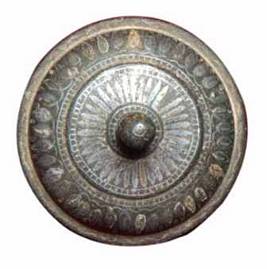 | Description / विवरण | Lid of a vessel. It has a domical body, topped by finial shaped solid knob and leaf shaped designed circles on its body. |