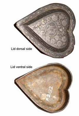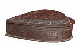 | Description / विवरण | Lid of a heart shaped betel nut box. The dorsal surface of the central portion of the lid shows a pepal leaf shaped raised part which is decorated with flower designs enclosing a label inscription in Persian characters at the centre. The boarder portion is also decorated with foliage designs. |