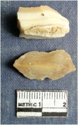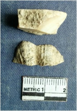 | Description / विवरण | 2 cut piece of shell with smooth cut edges and rough natural edges. Irregular in shape. Might have been debitage for the manufacture of shell object. |