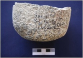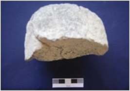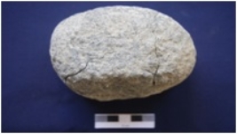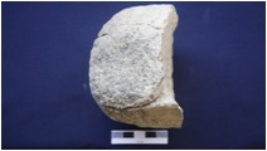 | Description / विवरण | Fragment of a Muller, made on granite, oval in section, smooth surface on one side, surface covered with encrustation. |