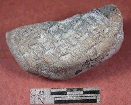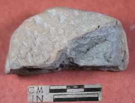 | Description / विवरण | Fragment of a scrubber with irregular shape having some design and rough surface. It is red in colour |