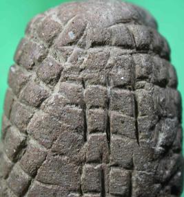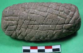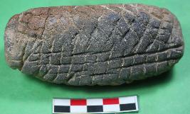 | Description / विवरण | Pestle oval in shape showing criss cross design on exterior Its colour is dull red and rough surface. It contain micca content. |