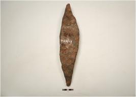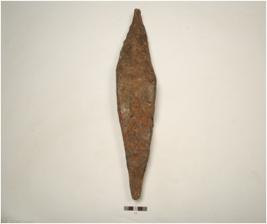 | Description / विवरण | A long rod with to pering to pointed either and rectangular section thick in middle, rough section, rusted in condition. |