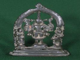 Standing Hindu Deity on pedastal. Two dawarpal on the both side. They stand under a arched doorway