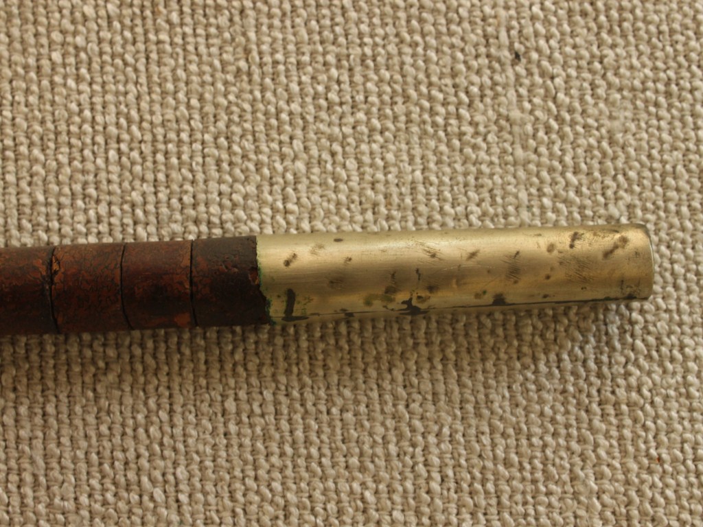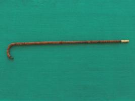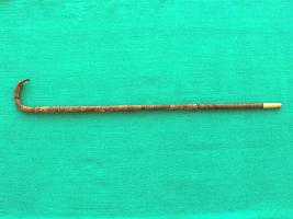 A wooden walking stick with a metal tip. The metal base is slightly rusted and many blocks are loosened and damaged. The walking stick alsi velvet padding at the holing part.