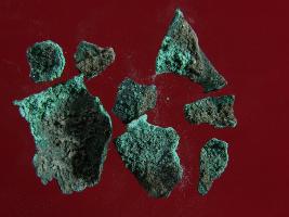 | Description / विवरण | Trench X to XV, LxB-D IX.50 cm, 1.90, 5.20 MBS at X, Stratum Layer 23 These are broken copper chunks, green in colour due to deposition of heavy patina on the surface of the object. Moreover the surface is rough.the broken shapes suggest that the object had a tube like object. |