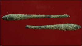 | Description / विवरण | Surface Find Two Copper Rods by their appearance it seems that there are two different copper rods. Hard patina with heavy deposition of dust and dirt. It is broader at one side. Appearance is of grey colour. |