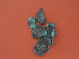 | Description / विवरण | Trench B, Length X1.25 , Breadth 3.30 m, Depth 1.00 mbs at X1, Stratum Pit 1 These are broken copper pieces. All of them have heavy deposition of patina on them. |