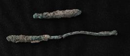 | Description / विवरण | Trench SGL-2 D, Length- XX.50 to XX.50,Stratum-layer 5. It is a corroded copper object . It seems an antimony rod with presence of patina over its surface. It is broken into two pieces. |