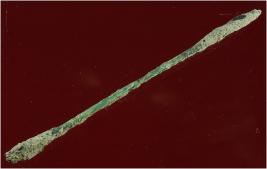| Description / विवरण | Trench ZA-9, LxB-D 1.50 mtrs x 4.50 mtrs - 2.70 mtrs at ZA9, Stratum Layer 15 It s a copper rod of green colour and rough surface and some thickness on two ends. Hard patina is present on it. It was used as a tool. |