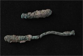 | Description / विवरण | Trench SGL-2 D, Length- XX.50 to XX.50,Stratum-layer 5. It is a corroded copper object . It seems an antimony rod with presence of patina over its surface. It is broken into two pieces. |