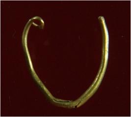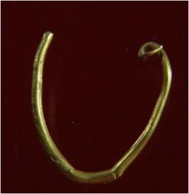 | Description / विवरण | It is a thin wire made of gold . Both of its ends are curved inside and give it a U shape. Appearance is smooth, shiny and golden. |