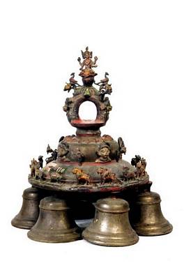 | Description / विवरण | This object with hanging bells certainly had a religious purpose, most probably of a bell itself in a shrine. It is decorated with tiny figures of deities, demons, birds and animals, shown at different levels. A three faced and four armed deity is shown seated on a lotus seat at the finial of the ring, meant to hold the bell object. A level below, on two sides of the ring, two peacocks are shown seated on flowery branches issuing up. At the base of the ring, two demonic faces are depicted. The upper sphere of the bell, below the neck is also decorated with demonic faces and base of the lower sphere has rows of animals . The bell has traces of paints at several places. |
