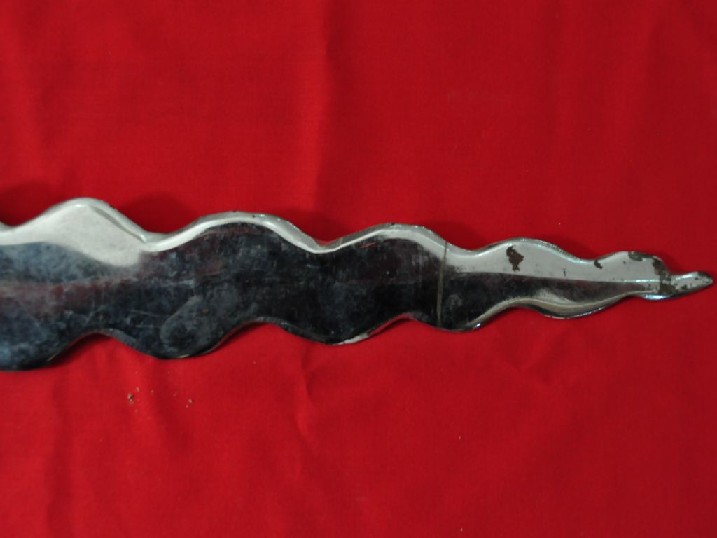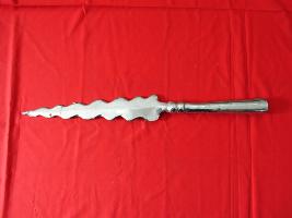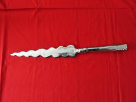 It is a arrow made of steel .It may be used for cutting and other defence mode.It has two part of it.It has some wavy design on its blade & nip.The upper side has a blade while bottom part has designed and parallel shape.Its surface is fleshy and shiny.
