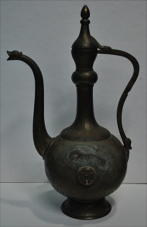 Brass flask chuski It is a brass flask with a curing snake like handle & a long curing spout for pouring drink. Both side of the main body are flattened where a round dish like piece decorated with nine red glass beads in circular form welded. A four armed goddess in circle is incised under the sport and handle. She is holding dagger & lotus flowers but the goddess incised under the handle has only one dagger & one hand is empty. The base & spout mouth, body are also decorated with incised floral pattern.