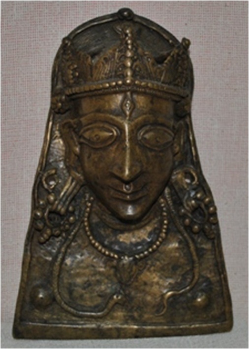 Bronze Head of Devi Mask type from Kullu . The face of the Devi with a benign smile is very expressive. All the features eyes, nose and chin are elongated. The crown on the head has pointed forms. They are supported on plaque at the back. Big Ratan- Kundala suspended from the ears. Three folds appear at the neck. Her necklace has a floral pattern.
