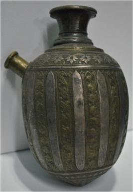 Its is round in shape and base in conical shape. Spout is small. There is decorated strips in golden colour.