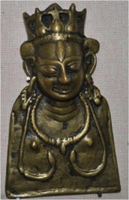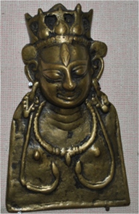 The hallow mask of the face of the goddess is at the top of a flat plate. There is a crown on the head. The eyes are large. The lobes of the ears with ratana Kundala appear as part of the plate. The necklace has oblong pendant in the centre. There is a large shaped mark on the forehead.