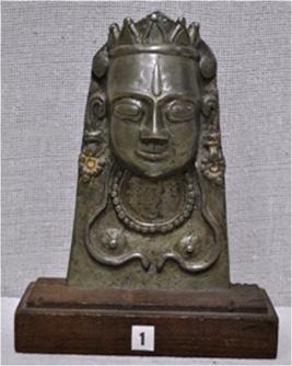 Bronze Mask It shows a goddess with a short crown over its head. Excepting the face, the rest of the bust is a flat sheet. The breast are also not very prominent.it is fixed on a wooden pedestal.