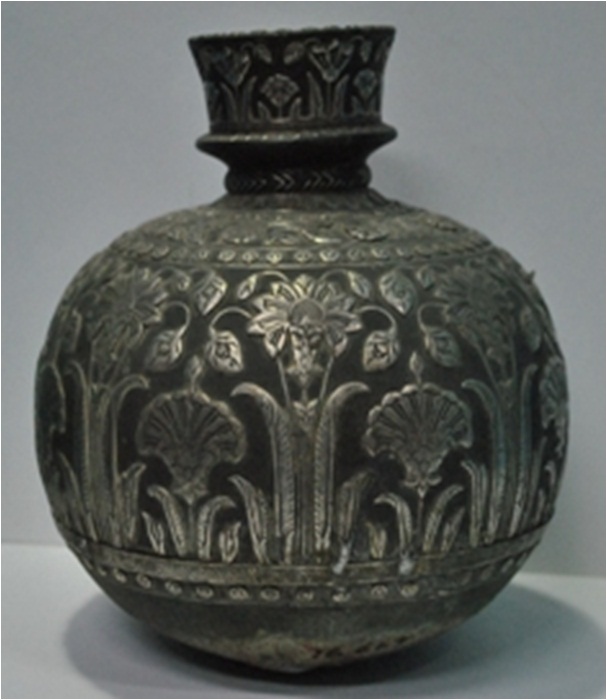 Pot bearing Bidri inlay work Hukka . On the neck and the whole body which is like a sphyere floral and leaf patterns in silver inlay are made alternately. Around the neck between two linear concentric circles are patterns of small flowers. Similar patterns are repeated, and in between the space floral and leaf patterns are repeated again. Above the lowest band of pattern in another band with zigzag lines like basket pattern in some painting. The background is black.