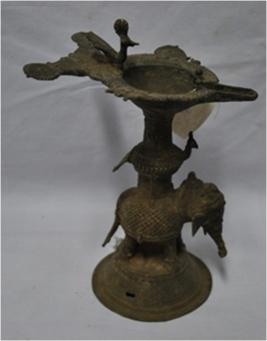 Over the round pedestal stands an elephant. On its back is a cylindrical shape with a figure of a peacock.