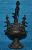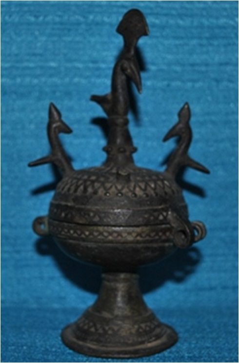 Brass vessel sindhur dani with a lid. At the top is figure of a peacock which is without a tail.