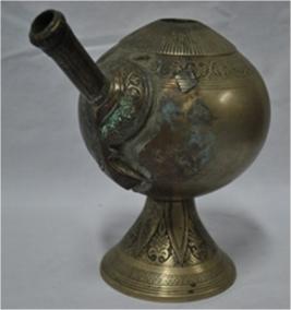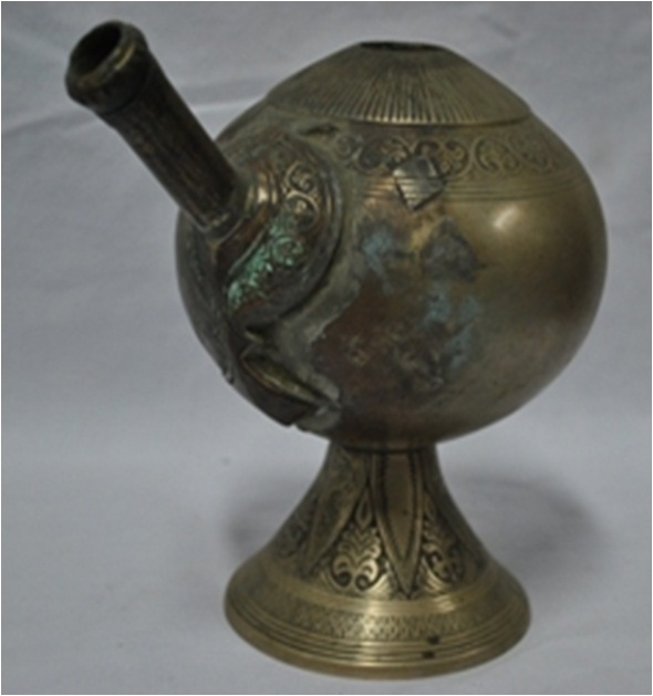 Hukka pot only It is a piece of caste bronze bell metal . The base is conical with leaves floral patterns. On the top around hole is a circular form with incised lines diverging from it. Along the circle is a border of meandering patterns which is 1.9cm wide.
