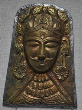Brass mask bearing a male face with moustaches. It depicts, most probably the God Surya Sun God . On the forehead there is the mark of the tilak which looks like the third eye. Below the neck the shoulders form a triangular shape the broadest side is at the base.